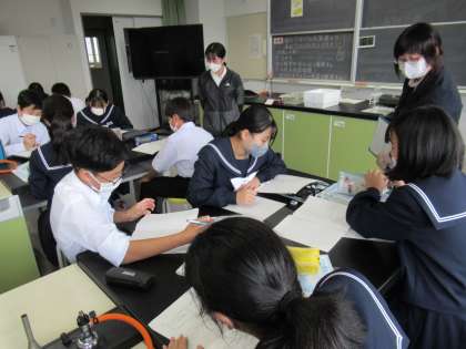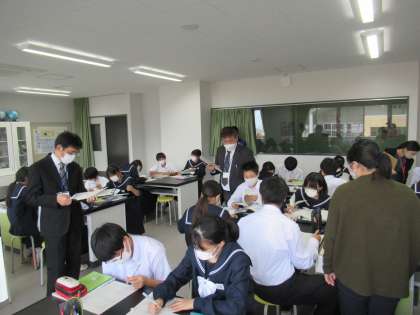 互見授業研修として、初任者の先生が授業を公開しました。多くの教員が参観しました。