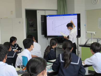 「溶解度」という言葉を使って、みんなの前で説明しています。