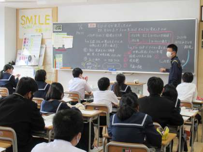 写真上・中は、道徳科の授業の様子です。「どうせ無理」という言葉に負けないという資料を読んで、諦めない心について考えています。