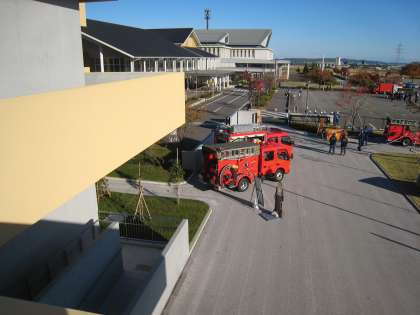 朝から学校敷地内とその周辺で消防総合訓練が行われています。