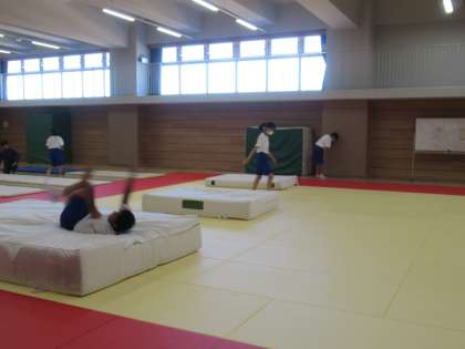 コースごとに分かれて、前方倒立回転跳びの練習をしています。