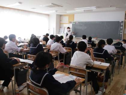 写真中は、社会の授業の様子です。ヨーロッパの農業には、どのような特色があるのか身近な例えを用いながら学習しています。
