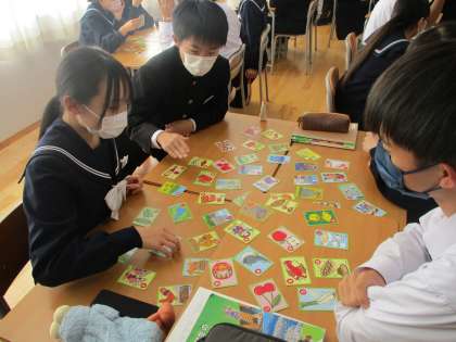写真中は、社会科の授業の様子です。都道府県カルタを通して、各都道府県の特産品を学習中です。