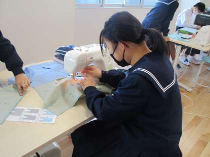 写真下は、家庭科の授業の様子です。エコバックを制作しています。まち針で印を付けたりミシンを用いて縫い始めたり、各自のペースで制作を進めています。