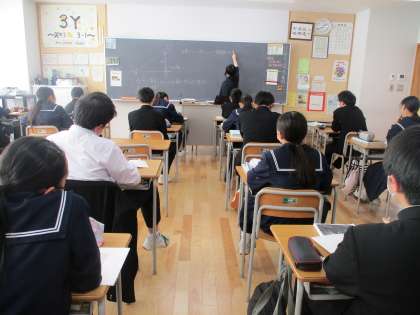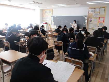 写真中は、数学の授業の様子です。テストの解説を聞いています。今回間違えた問題が再び出題された時に間違えないようにしっかりと話を聞いています。