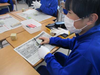 写真下は、美術の授業の様子です。様々な大きさのやすりを用いて石彫をしています。今日はイメージした形になるように大まかに削っています。