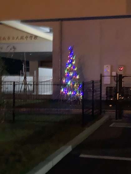用務員さんが、「八尾のニワ」と玄関前の植木に素敵なイルミネーションを設置してくださったおかげで、夜もとても明るくキラキラ輝いています。