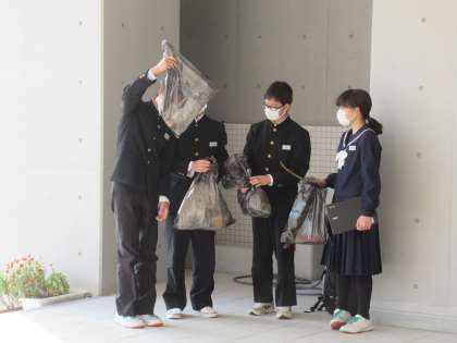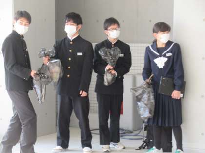 学年生徒会のメンバーがゴミ袋を持って挨拶運動中です。