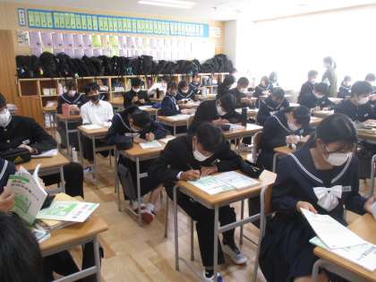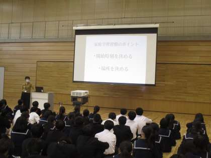 そして、期末考査を前に学習面でも頑張ってほしい!と、教員主催の学年集会を開きました。学年主任からテキスト学習についてのお話がありました。