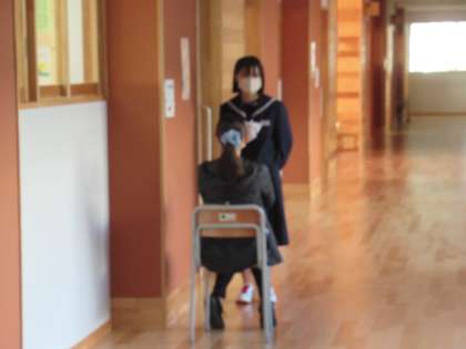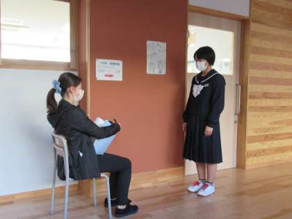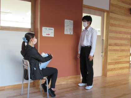 一人ずつ廊下に出て、先生の前で「竹取物語」の冒頭を暗唱しています。