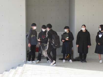 生徒玄関前では、3学年生徒会がYCP(やつお クリーン プロジェクト)の活動展開中です。毎週水曜日はゴミ拾いをしながら登校する日です。美しい八尾町にしようと頑張っています。