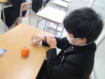 机上にそれぞれ野菜や果物を置き、粘土をこねています。