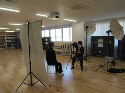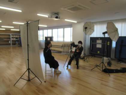 朝から、卒業アルバム用写真撮影をしています。まずは、教職員が校舎をバックに撮影し、生徒は一人一人集会室に用意されたスタジオにて撮影しています。