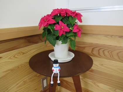 ポインセチアが登場し、花鉢のそばには雪だるまがちょこんと座っています。
