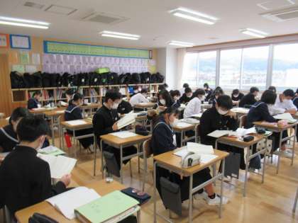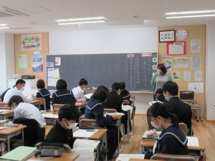 写真上中は、国語科の授業の様子です。有名な「徒然草」の「仁和寺にある法師」を音読中です。中学生の頃に暗唱した冒頭の一節は、ずっと記憶に残りますよ。