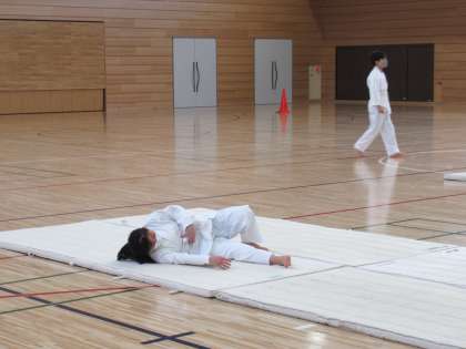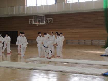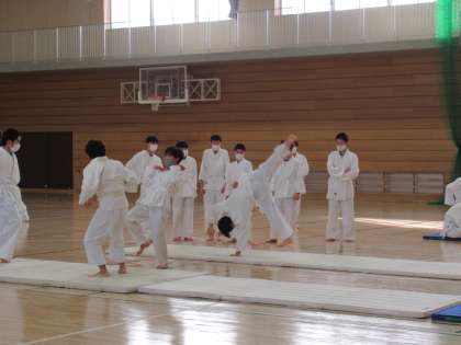 柔道とマット運動の実技テスト中です。