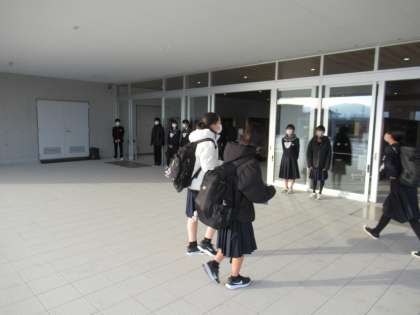 今日は、生徒会執行部が朝の挨拶運動をしています。元気のよい挨拶の声で新しい週がスタートします。