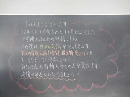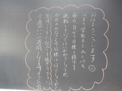 毎週月曜日、黒板に温かいメッセージが書いてあります。担任の先生の思いが届いていますか。