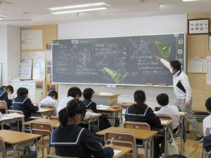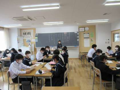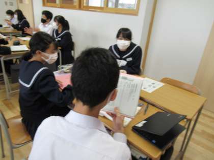 故事成語を1つ選び、それを使った作文をグループで紹介し合っています。