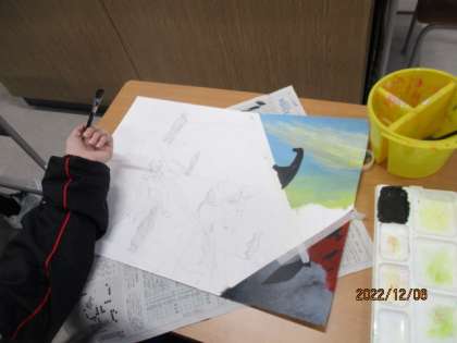 読書感想画の着色がまた一段と進みました。どんどん本の内容が明らかに、、、。何の本かな。