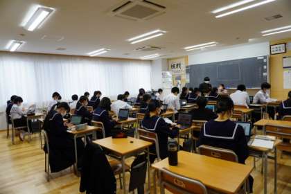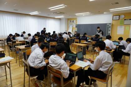 同じ業種に興味をもつ生徒どうしで班をつくり、その業種について調べています。