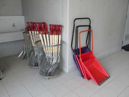 生徒玄関前にスタンバイOKです。融雪用ホースも用務員さんが準備してくださっています。準備万端!