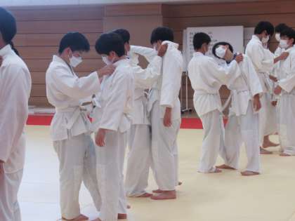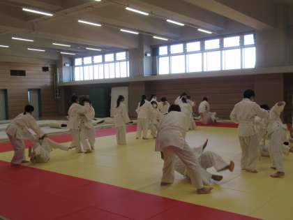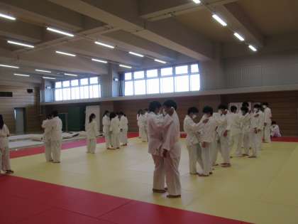 柔剣道場で柔道の授業中です。 今日は投げるところまで進めています。