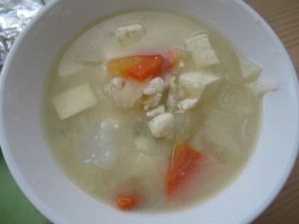 「打ち豆汁」は、かぶや大根、里芋等と一緒に打ち豆を煮て、味噌汁にした料理です。「打ち豆」とは、大豆を蒸して、木づちで一つ一つ潰して花型にし乾燥させたもので、雪の多い湖北地域を中心に広がっています。蒸した大豆を木づちで潰すことにより、火が早く通り、豆に味がよく染みます。さらに大豆のだしもとれ、柔らかい触感は老若男女問わず食べやすく工夫してあります。