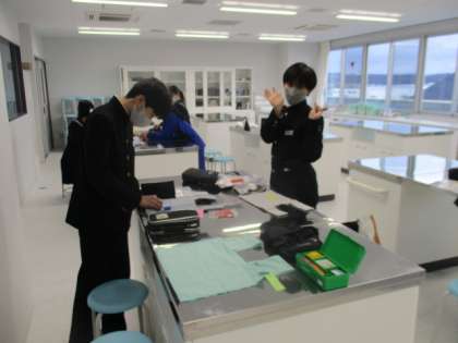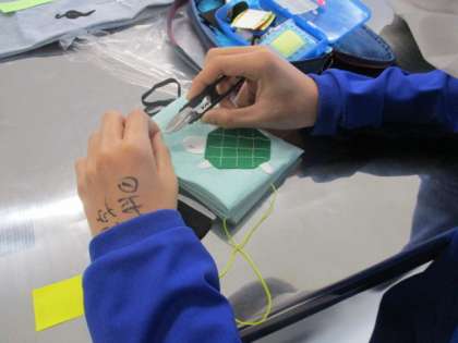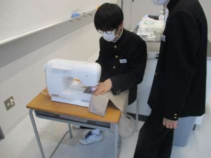 放課後、家庭科室で友達と協力しながら作品を仕上げています。