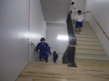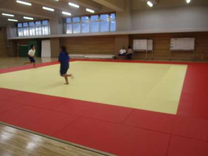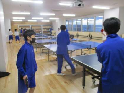 卓球部は集会室で基礎打ち、サッカー部は階段ダッシュ、柔道部は畳の上を走っています。