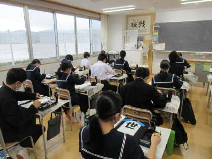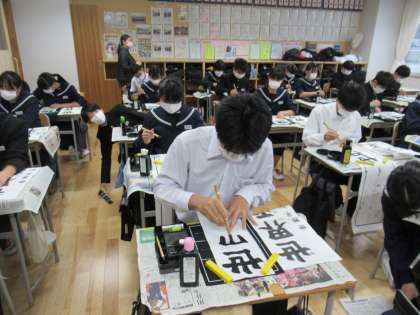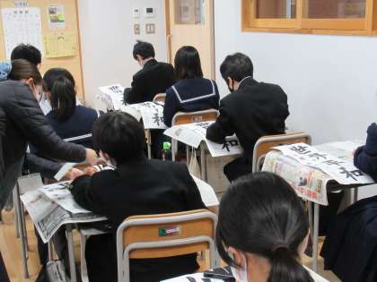 書き初めのお題は、「世界平和」です。 一筆一筆に平和への願いを込めて書いています。