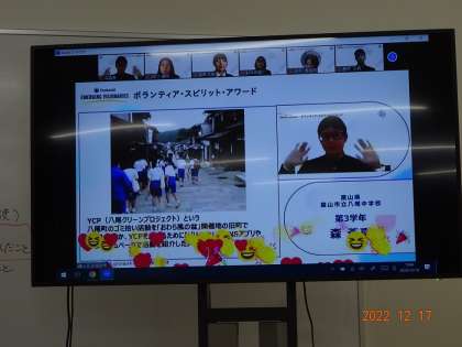 12月18日(日) ボランティア・スピリット・アワード 授賞式 公開日 2022/12/18 更新日 2022/12/18 3学年 本日、ボランティア・スピリット・アワードの授賞式がオンラインで行われました。 八尾中学校は、全国から30組のブロック賞の一つに選ばれました。 今回の授賞式では、さらに上の賞が発表されましたが、残念ながら、上位の賞を受賞する夢は叶いませんでした。 しかし、出席した学年の代表たちは、全国の中高生の様々なボランティアに関する取組を学ぶことができました。
