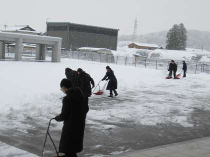 今日の除雪当番は、3年1組です。早朝から、除雪作業に励んでいます。おかげで、生徒玄関に続く道が確保されました。ありがとうございます。