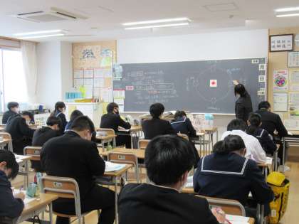 太陽の周りを地球が回る様子を図で示しながらの説明を真剣に聴いています。