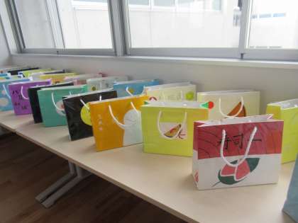 3年生は家庭科でオリジナルエコバッグ、2年生は美術でショッパーズバッグ、、、どちらもすぐにでも商品化されそうな素敵なものばかり。
