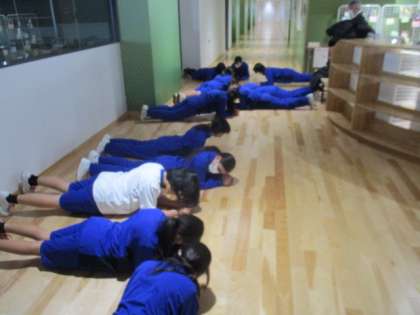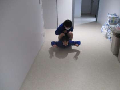 ソフトテニス部、陸上競技部は、廊下で体幹トレーニングを行っています。