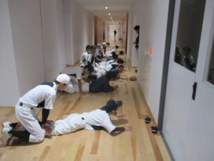 室内で筋力トレーニングをした後、今日は、スポーツのニワ(ピロティ)で活動予定です。
