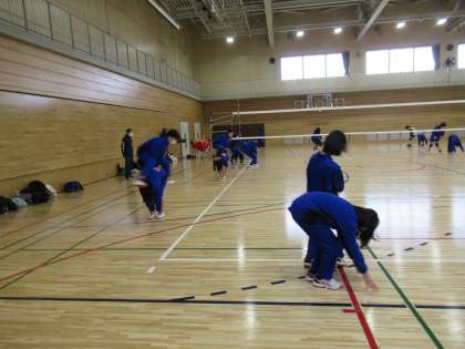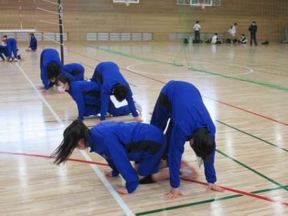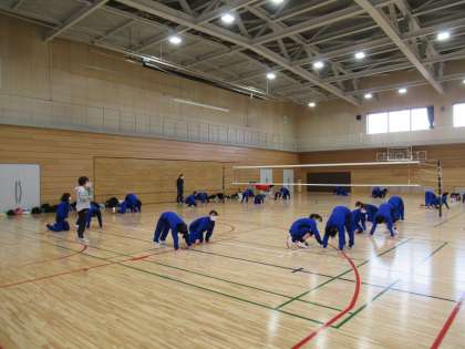 バレーボール競技に必要な動きを基礎トレーニングを通して学んでいます。横になったり、跳んだり、、、。
