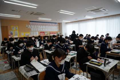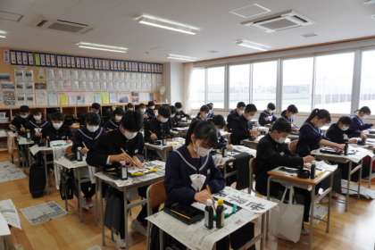 どのクラスも静かに書き初めを行っています。世界平和を祈りながら、筆を進めています。