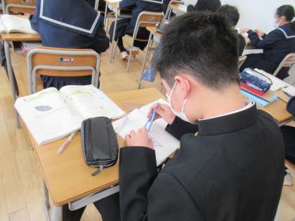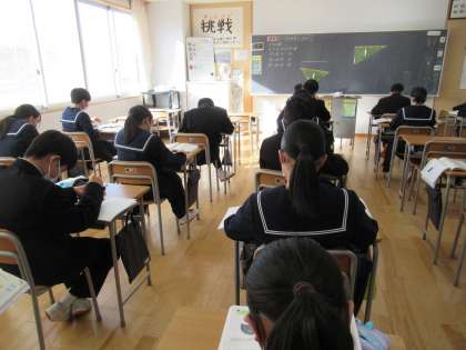 写真上は、英語の授業の様子です。道案内の表現を学習しています。小学校のときに学んだ表現に加えて、中学校で初めて学ぶ表現があり、興味津々に聴いています。ALTのJ先生の授業で、実際に道案内するという目標をもって、真剣に取り組んでいます。