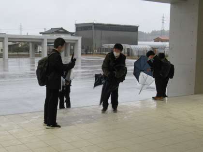 傘に付いた雨を切ってから校舎に入る素敵な生徒たちです。