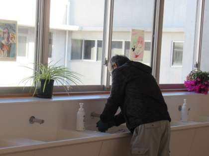 授業中、用務員さんは手洗い場や廊下の清掃をしてくださっています。美しい環境が保たれている秘密はここにあります!