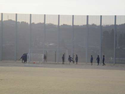 陸上競技部は学校の周りを走り、サッカー部はミニゲームをしています。