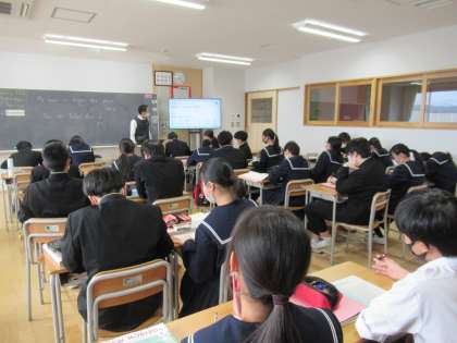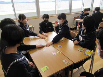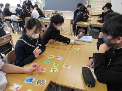 1月18日(水) 2年生 授業の様子 公開日 2023/01/18 更新日 2023/01/18 2学年 写真上・中は、社会の授業の様子です。特産品等が書かれた「都道府県カルタ」をしています。生徒は大盛り上がり!楽しく学習しています。 写真下は、英語の授業の様子です。比較級について学習しています。