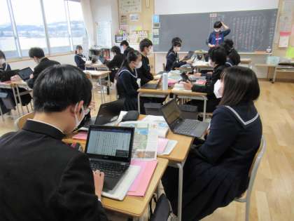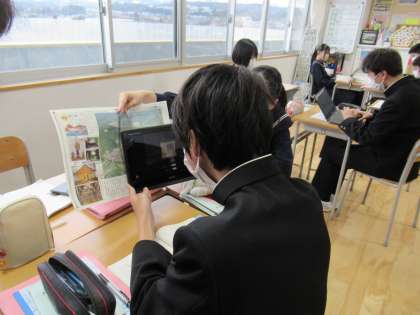 1月23日(月) 3年生 授業の様子 公開日 2023/01/23 更新日 2023/01/23 3学年 写真上・中は、国語の授業の様子です。松尾芭蕉が訪れた「平泉」についての説明を、資料のQRコードをchromebookで読み取り、解釈しています。 写真下は、社会の授業の様子です。少子高齢化が進む中、日本の財政はどうなっていくのかについて考えています。深刻な問題ですね。