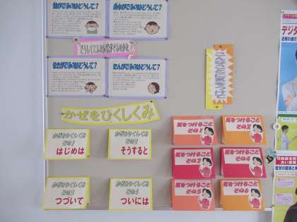 保健室前の掲示が、健康おみくじから風邪予防の掲示にチェンジしています。冬は空気が乾燥するため、ウィルスが元気になります。適度な湿度が必要です。また、体温が低くなると免疫が落ちてしまいます。体を冷やさないようにして、風邪にかからないようにしましょう。