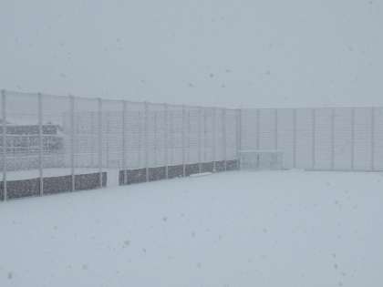 グラウンドの倉庫の扉や、フェンス、国旗掲揚塔等から、雪の深さが感じ取れます。かなり深いです。野球部のベンチはすっかり埋もれています。