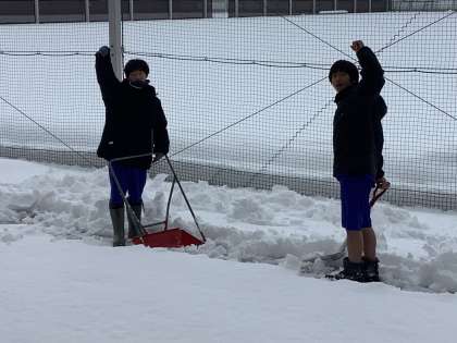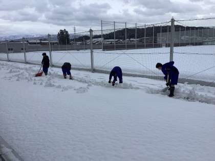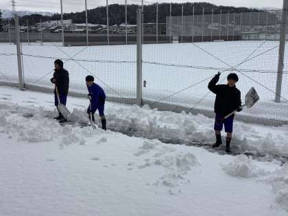 部活動の時間、サッカー部を中心にグラウンド側通路を除雪していました。