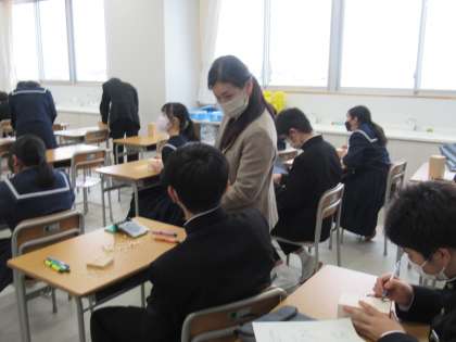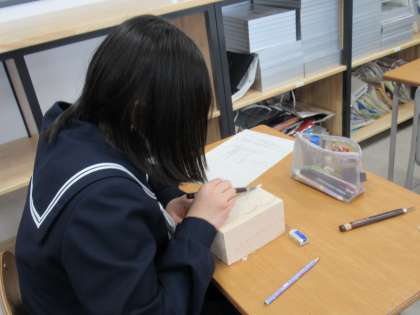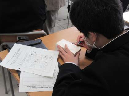 想像の生き物を木に描き、彫刻刀で彫っていきます。