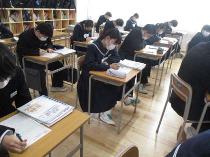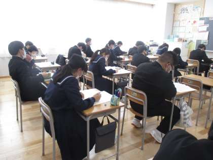 3年生は、明日の私立高校一般入試に向けて、各教科で総仕上げをしています。プリントや過去の問題を使って自主的に学習を進めています。